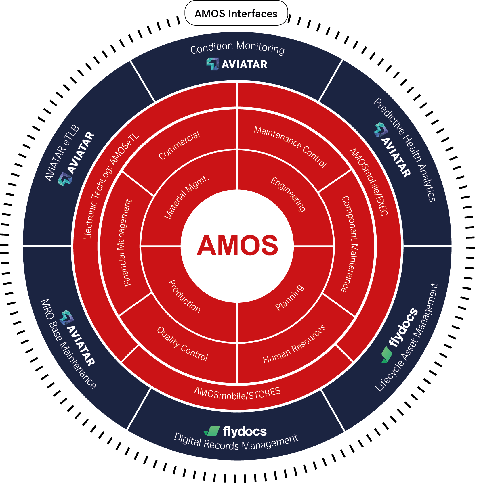 AMOS is built around eight core modules covering maintenance, engineering and logistics processes. Optional functional sets, including human resources and financial management, extend the scope for specific organisational needs while remaining fully integrated within the AMOS platform.