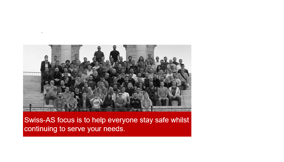 Swiss-AS is fully committed to supporting all customers on the projects that continue and we will make best use of audio and video technology to ensure progress on the activities and mitigate the impact of not being able to meet face to face. We have comprehensive online collaboration capabilities for our employees to communicate with customers and each other. Our focus is to help everyone stay safe whilst, at the same time, continuing to serve your needs.